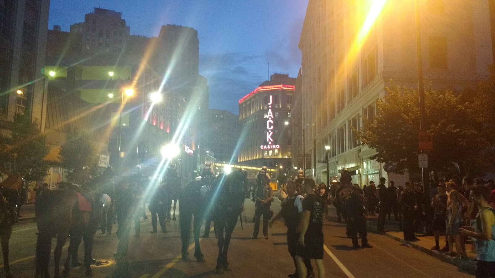 Away from the protests in the tight streets around the arena there are all these earnest Midwestern and Mormon Republicans threading through the crowd; something different about their heavier bond structure. Curiously handsome people. And the women, with a primped and styled Fox News aesthetic, sensible but snug dresses over gym-worked waists, heels everywhere clacking along the hot sidewalks. The occasional natural beauty. Dull-eyed locals and homeless taking it all in.