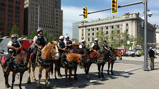 The expected unrest at the Republican National Convention ending the day before never developed. I was frankly disappointed. The streets had been flooded with law enforcement officers. Everywhere troopers--from everywhere--California Highway Patrol, Missouri, Indiana, Florida state troopers--in squads or moving through the crowd in threes and fours, fielding the condescending handshakes and thank-yous of the respectable crowd. And almost as many bike as foot platoons, moving, or staging for their next move, never staying put anywhere before a sergeant barked the command had them moving again in disciplined columns. Mounted police, more bicycle cops, motorcycle cops, dog teams, stray SWAT pairs in full gear, Secret Service directing traffic into and out of the arena.