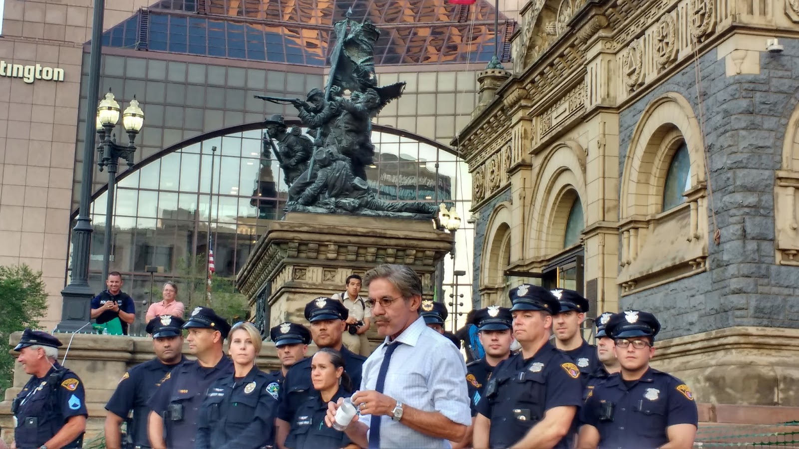 In the middle of it all the Cleveland cops in their old school uniforms, black, classic peaked hat with visor, like something out of a seventies cop movie. Buffed-up cops, with tattoos, fat, powerful-looking pot-bellied cops, big, shambling old-school cops, all of them looking just like cops. Spotters on rooftops. Everywhere cops.